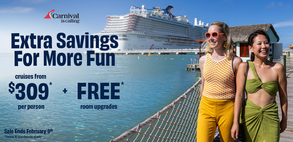 Set sail on an unforgettable Carnival Cruise adventure with incredible savings! Cruises starting from just $309 per person plus FREE room upgrades.